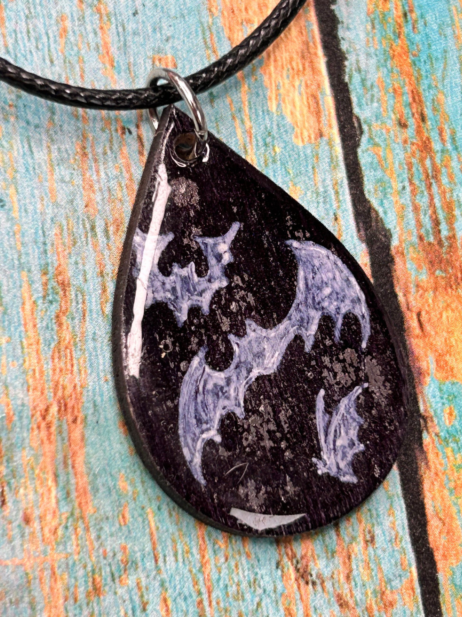 Let the Batty be your charm! This unique, handcrafted wooden pendant is painted with three bats, making it a perfect accessory for the creature-loving fashionista. Wear it to add a touch of spooky style to any look!