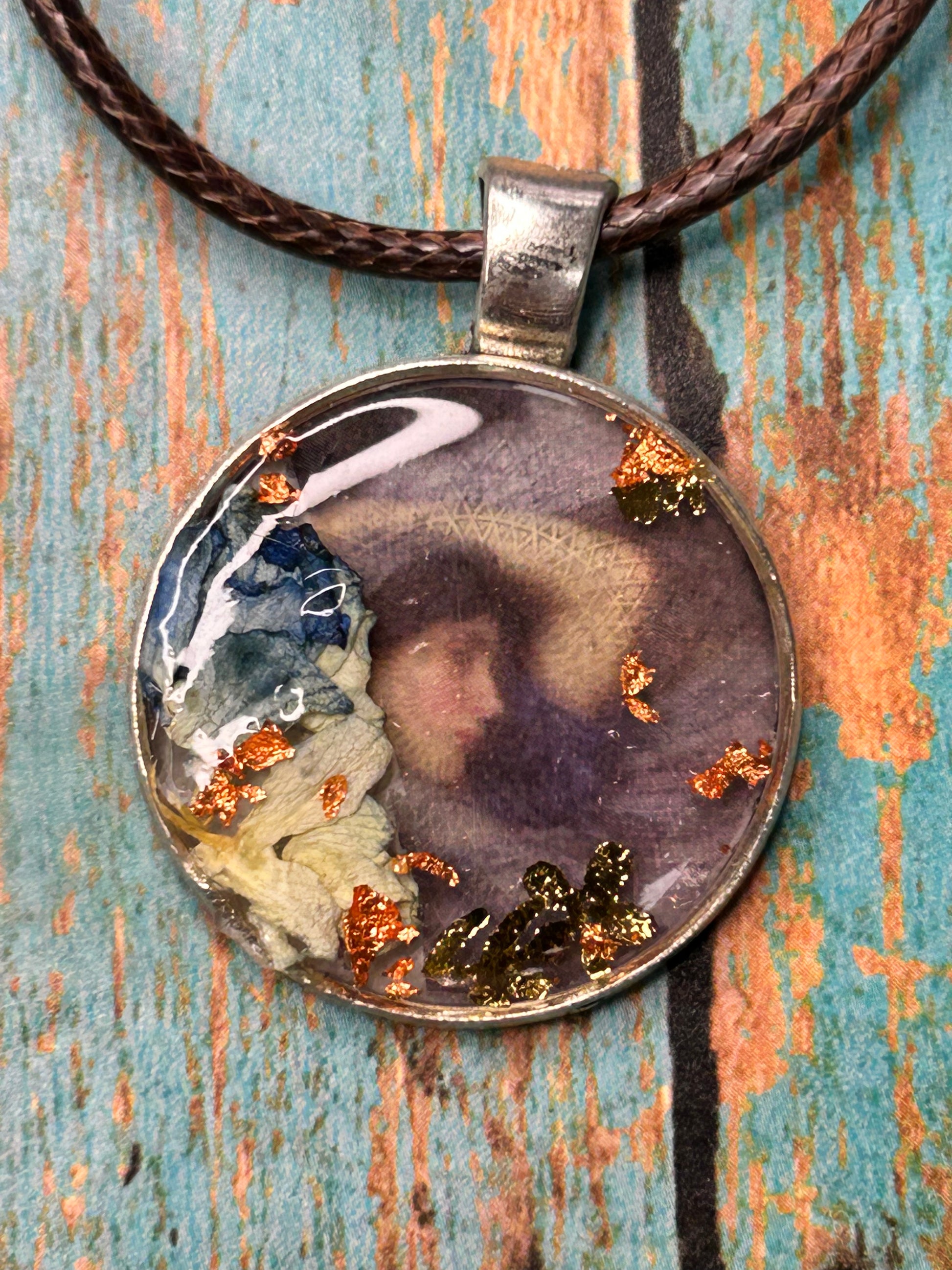 This beautiful Classical pendant is a timeless piece of jewelry that will add a classic vintage feel to any outfit. It features delicate dried flowers, creating a unique and eye-catching design. It's the perfect way to add a subtle touch of sophistication to your look.
