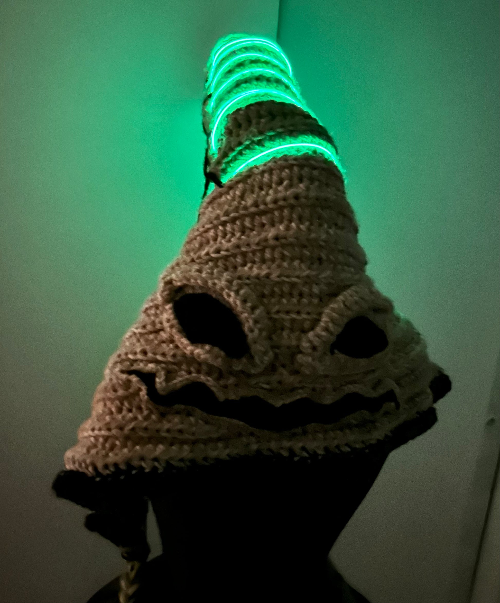 Roll the dice and take your chances with this unforgettable Oogie Boogie-inspired hat. One of a kind and with its own built-in LED light, "Gambling Man" is a perfect accessory for every gambler who likes to take risks in style. Roll the dice, light up the night, and see where you land! (Original pattern made by Twisted Hatter)