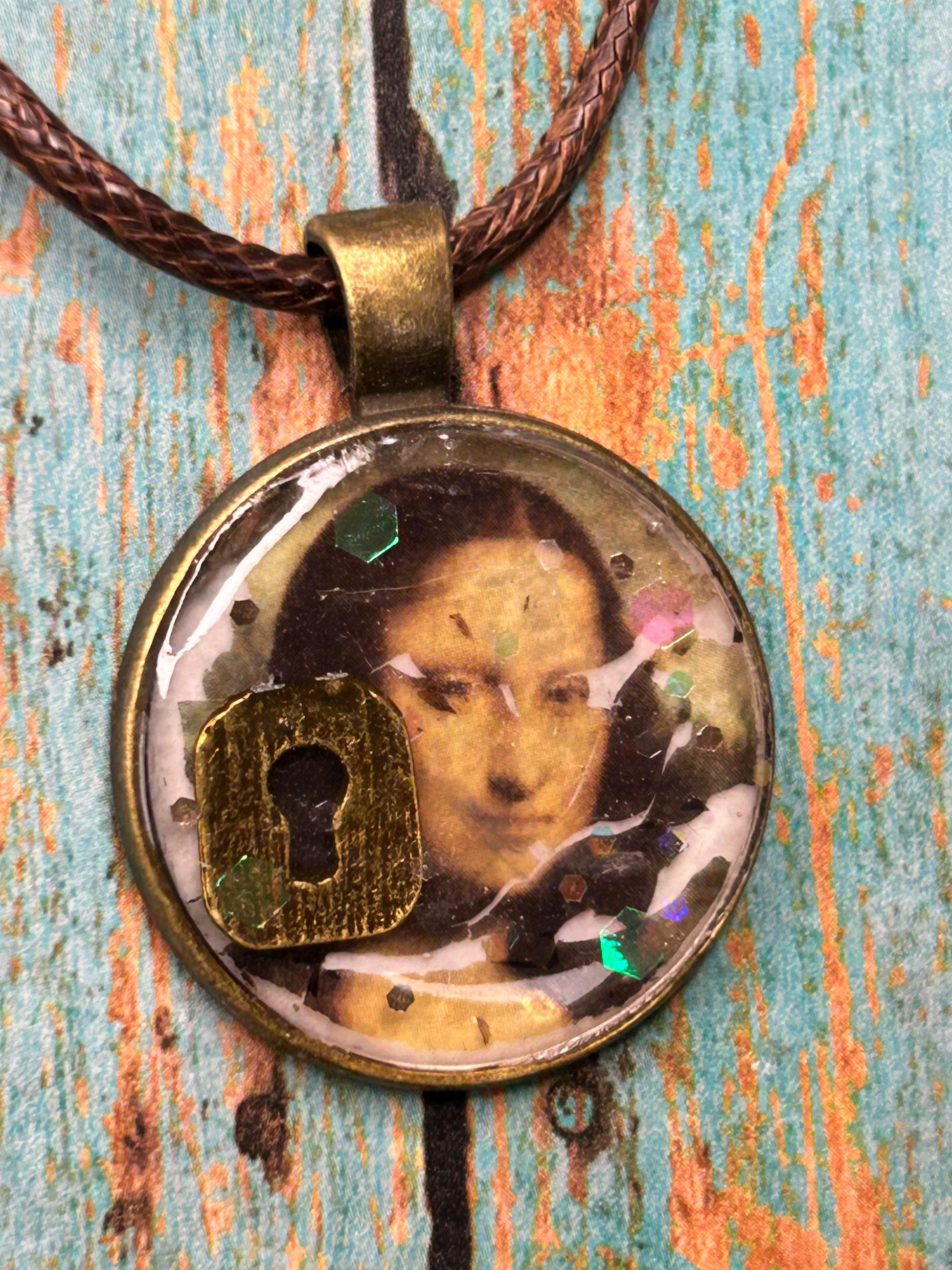 This found item pendant features a classic Mona Lisa background and key hole to keep her secrets safe.
