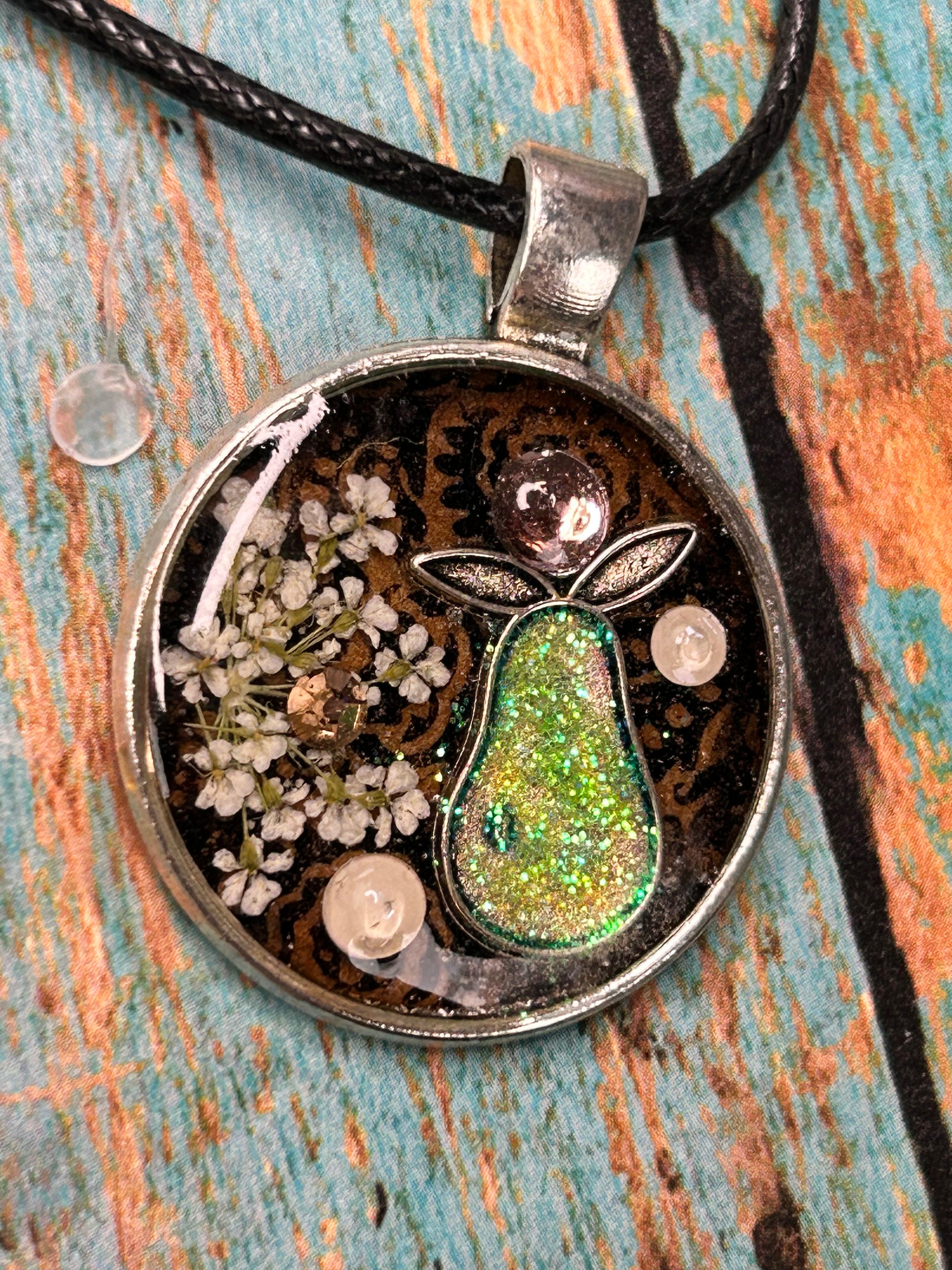 Pears and Pearls provides a unique statement piece with its found object pendant. Constructed from a combination of metal and pearls, this pendant is sure to add a special touch.
