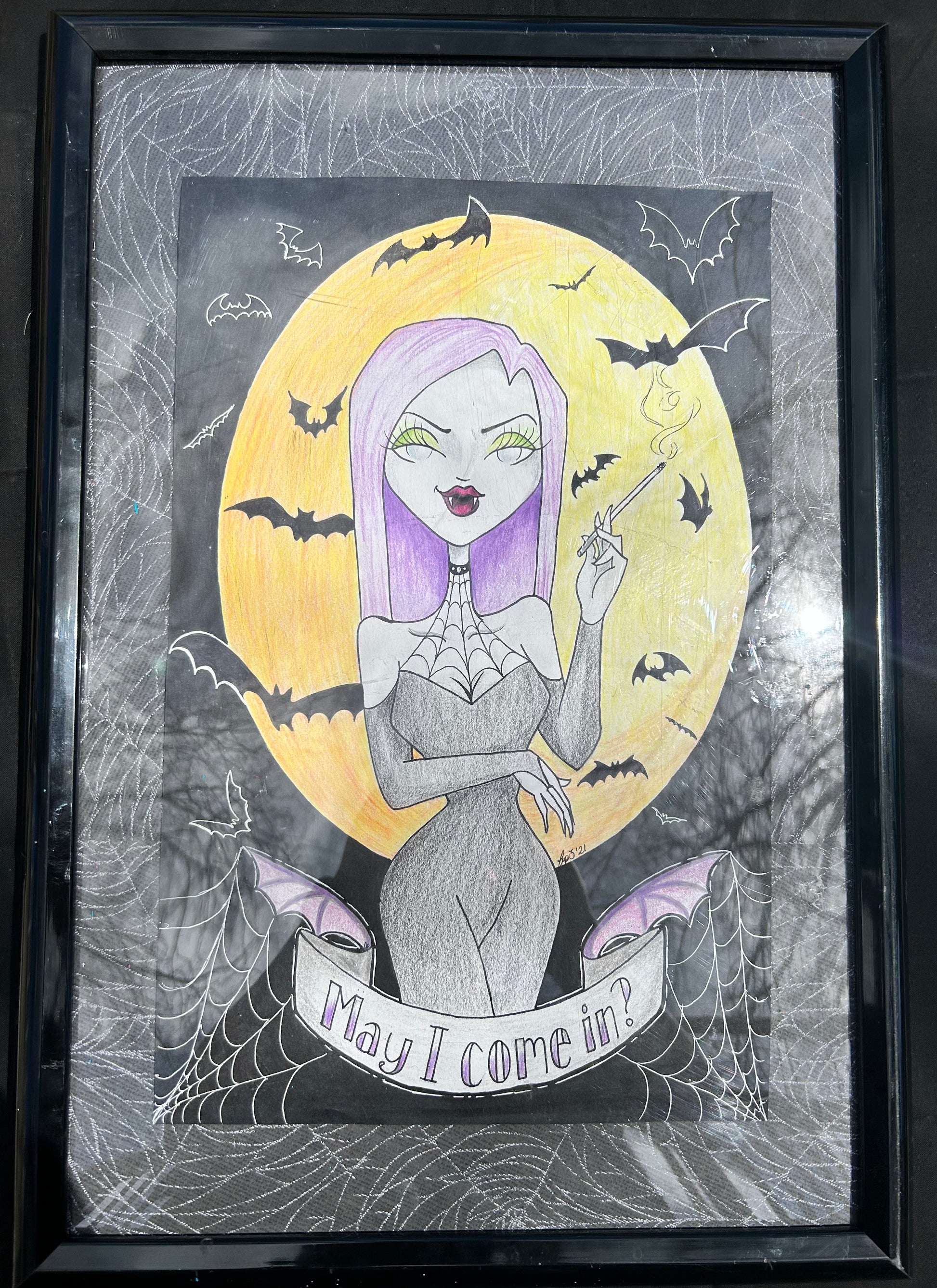 Let her know you're ready to rumble with this vampire cutie drawing! This edgy welcome sign will make visitors take notice and invite them to stay a while! Unleash your inner rebel and show your love for the dark side with this unique piece of art. Don't be scared, let her in!